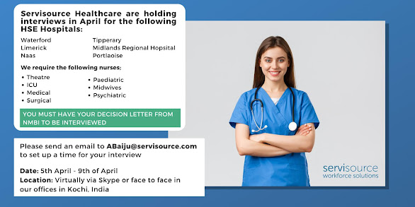 The vacancies are for Midland Regional Hospital, Portlaoise, Limerick, Tipperary, Waterford and Nass HSE Hospitals. The interview will be held from April 5th to 9th in Kochi.